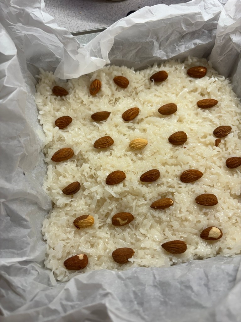 Mix the condensed milk and coconut. Spread it out in an 8×8 pan–use a smaller pan if you like it thick or a bigger one if you like it thin. Place the almonds in neat rows across the top. Poor melted chocolate over the top and spread it out evenly. Place it in the freezer to set. After an hour or so, before they’re completely frozen, chop them into bars–whatever size you like.