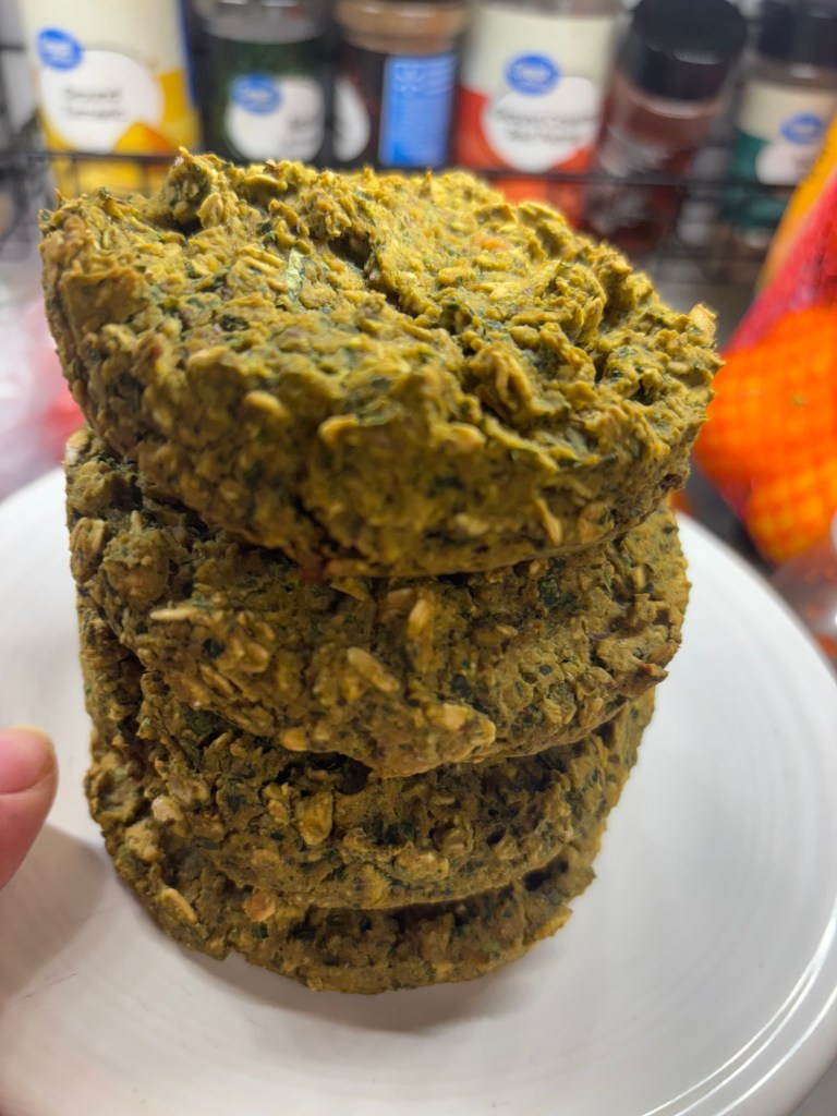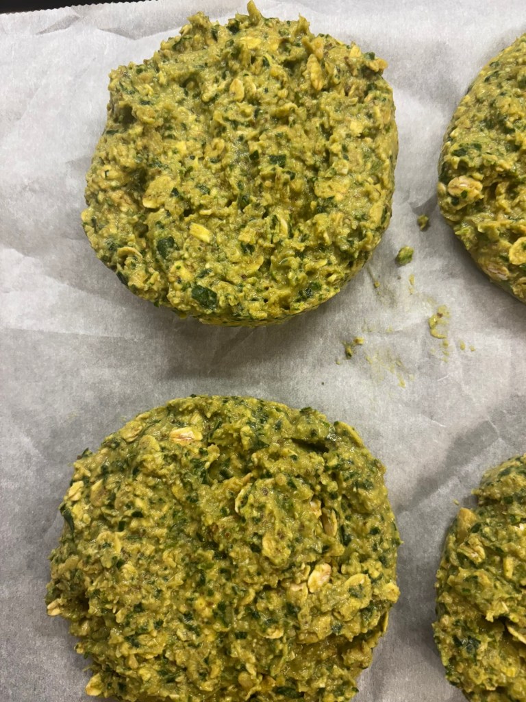 When everything is stirred together, use a biscuit cutter to mold burger patties on parchment paper. Or do it by hand. The batter should be wet but not soupy if too wet, add more oats–if too dry, add a bit of water